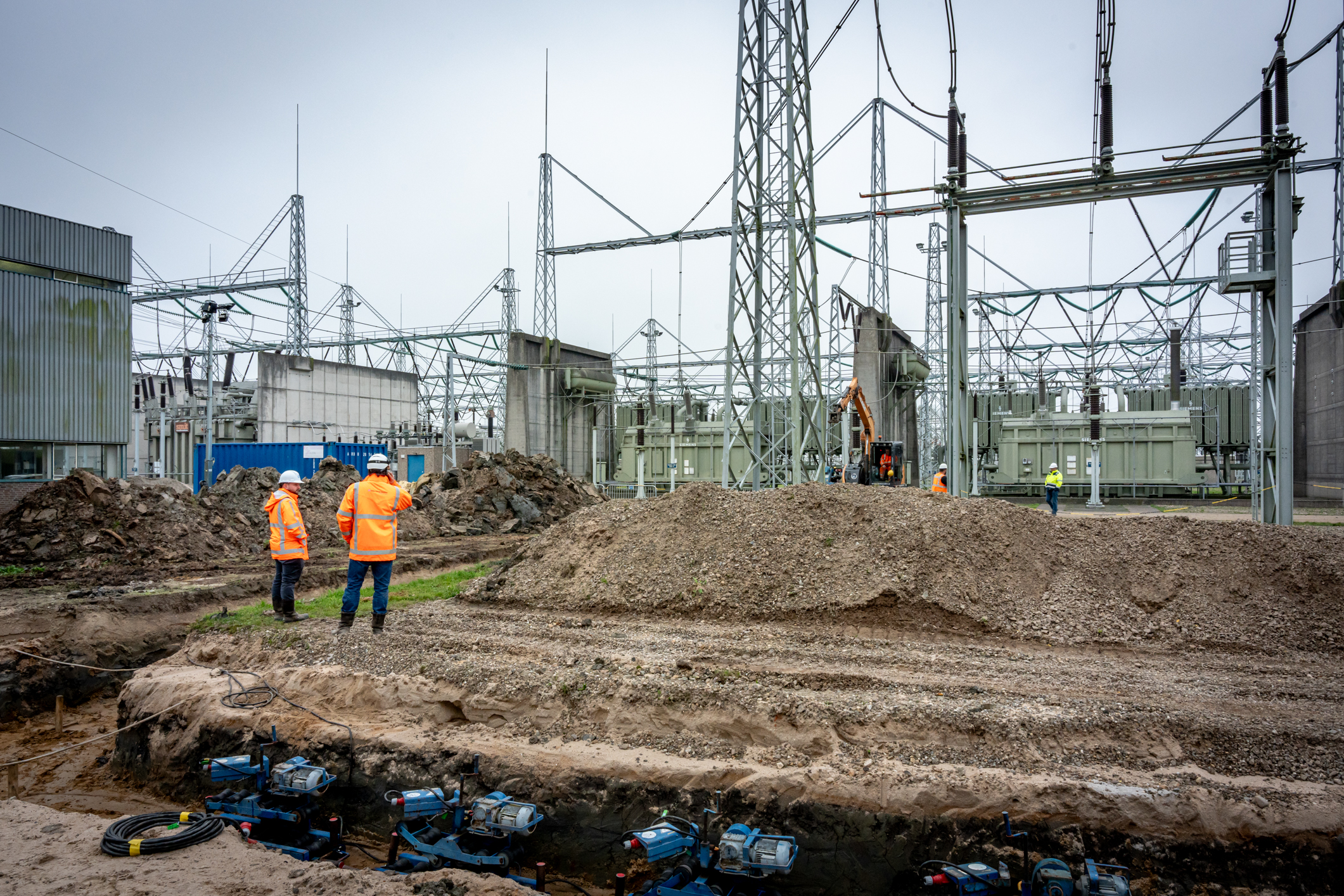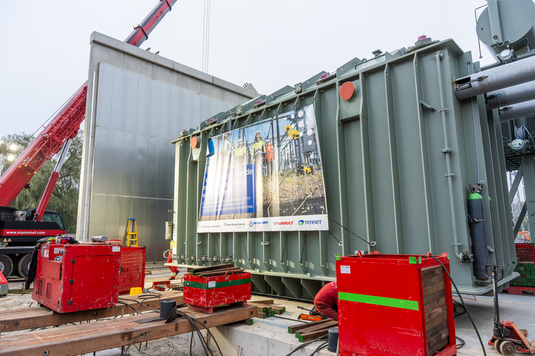 In 3 weken zijn de veldfundaties opgeleverd, de scherfwanden, het veldhuis, het eerste staal & componenten geplaatst. Daarnaast ook begonnen met de ontgraving voor de aan te leggen 150kV kabel. Nu gaan we verder door met het opbouwen van de componenten. Binnenkort worden de panelen voor het nieuwe veldhuis geleverd en volgende week start de secundaire kabeltrek. Ondertussen legt Van Hattum en Blankevoort de laatste hand aan de transformatorcel met geluidsbekleding, roostervloeren en het laatste grondwerk. Ook zijn de scherfwanden geplaatst om de transformatorcel gereed te maken voor de transformator. De nieuwe megatransformator is onder veel mediabelangstelling op zijn plek aangekomen. Hiermee werken we toe naar de volgende mijlpaal; het plaatsen van deze 500mva transformator en 50kV compensatiespoel.